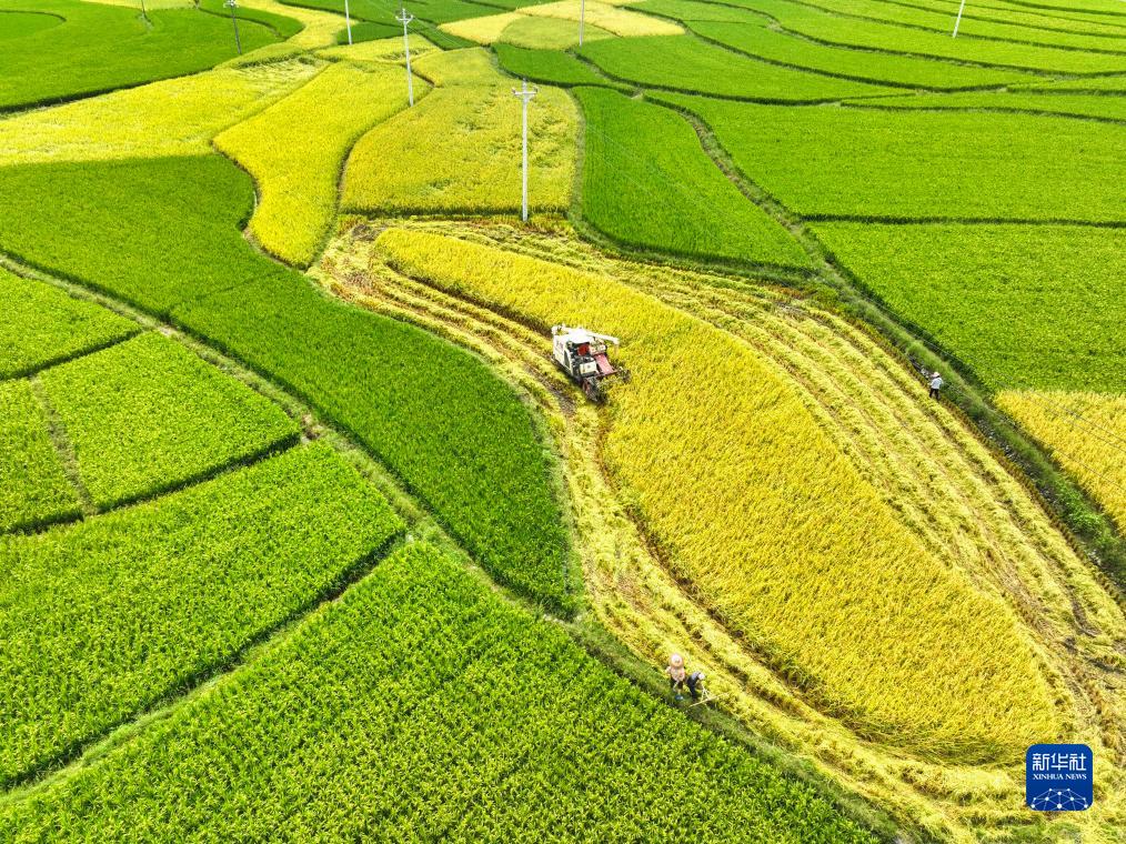 9月16日,湖南省郴州市桂陽(yáng)縣流峰鎮農民駕駛收割機在收割水稻(無(wú)人機照片)。