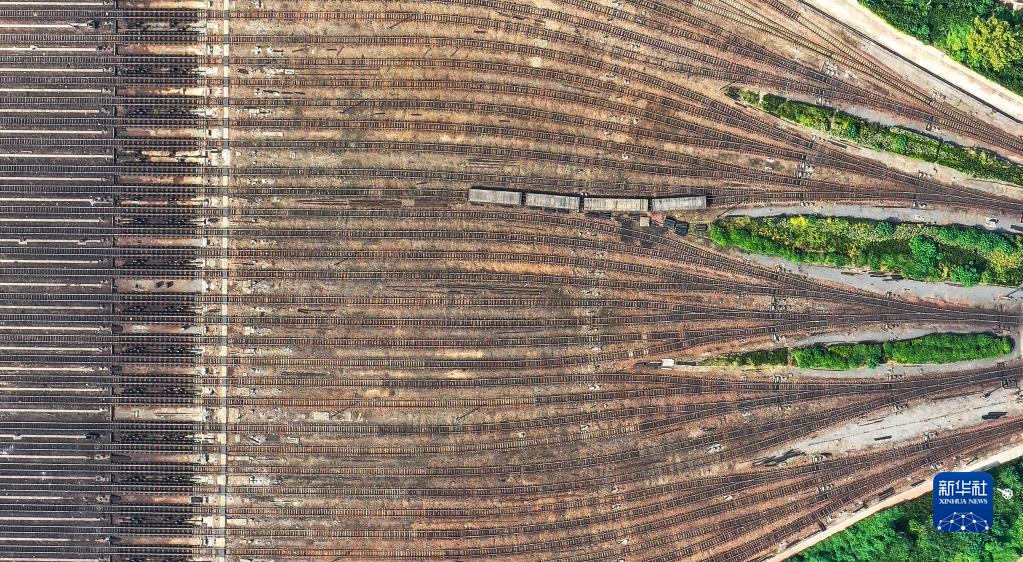 9月17日,在鄭州北站編組場(chǎng),為中歐班列(鄭州)選扣好的空車(chē)底通過(guò)駝峰溜放至固定股道(無(wú)人機照片)。