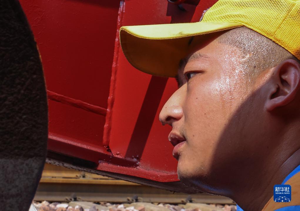 9月17日,在鄭州北站編組場(chǎng),中歐班列(鄭州)整備班組的貨車(chē)檢車(chē)員在檢查車(chē)輛輪對技術(shù)狀態(tài)。
