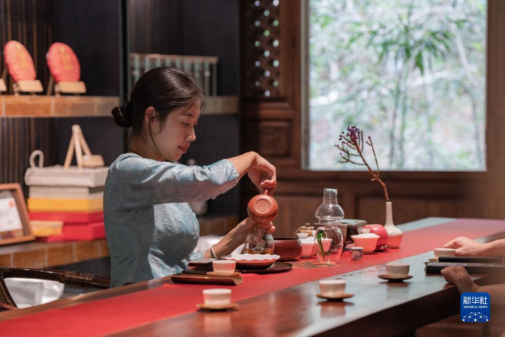 在景邁山布朗公主茶廠(chǎng),傣族姑娘葉香在給顧客泡茶(9月14日攝)。