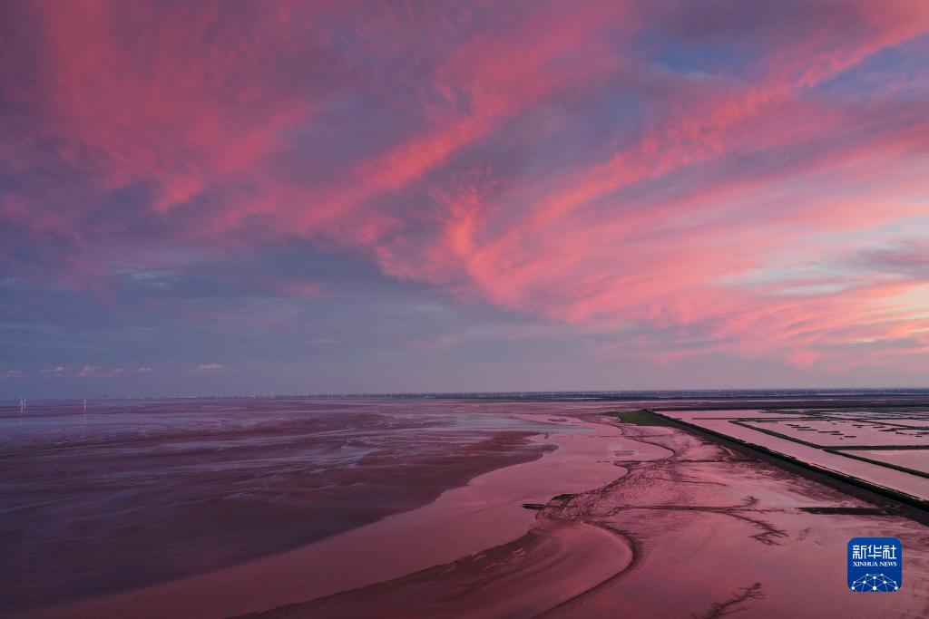 夕陽(yáng)下的鹽城東臺條子泥濕地(2023年8月31日攝,無(wú)人機照片)。