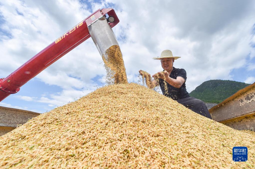 9月18日,農民在貴州省銅仁市松桃苗族自治縣普覺(jué)鎮水稻種植基地收獲稻谷。