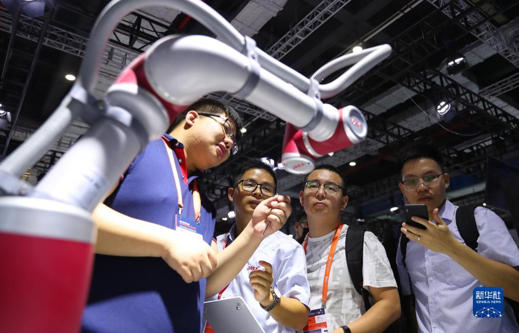 9月19日,工作人員(左)與參觀(guān)者在一個(gè)進(jìn)行作業(yè)演示的機器人展品旁交流討論。