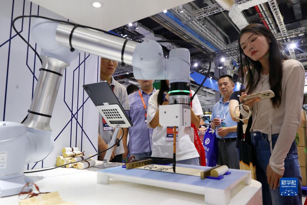 9月19日,機器人在展覽現場(chǎng)進(jìn)行書(shū)法展示。