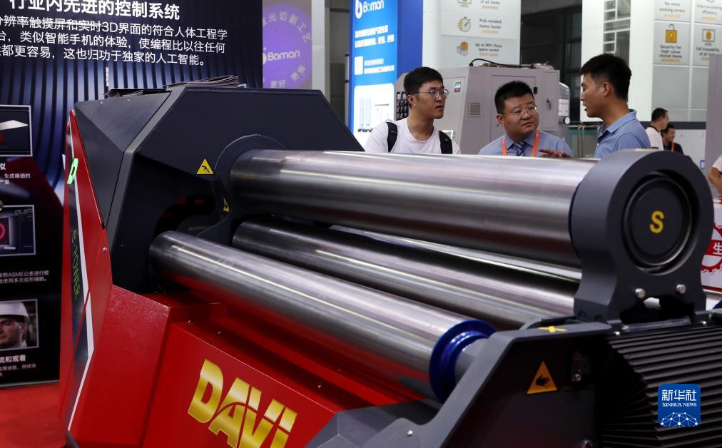 9月19日,參觀(guān)者在一個(gè)四輥卷板機旁交流討論。