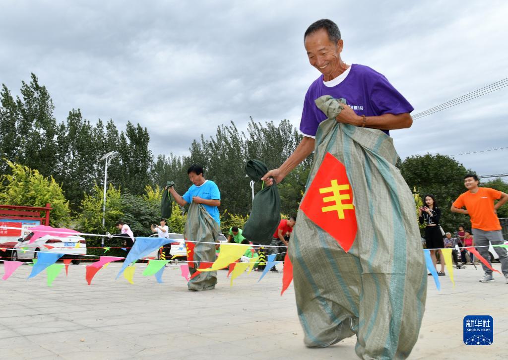 9月19日,農民在肅寧縣師素鎮農民趣味運動(dòng)會(huì )上進(jìn)行袋鼠跳比賽。