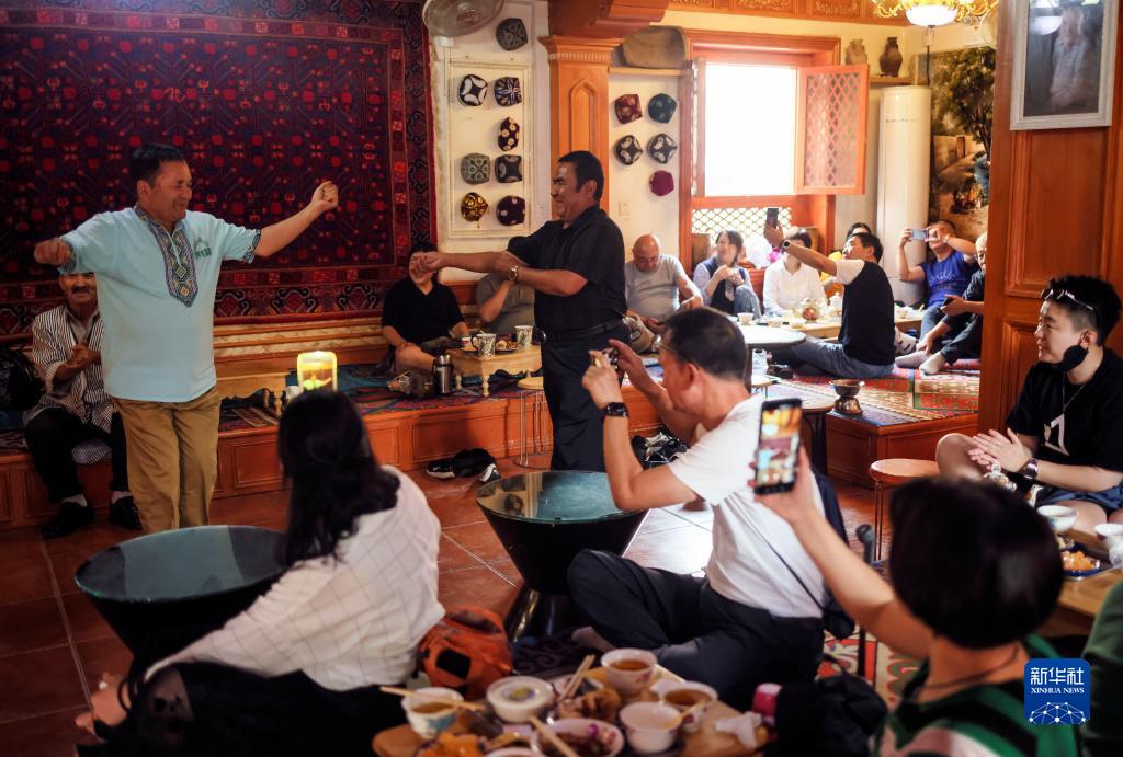 在新疆喀什古城百年老茶館內,人們隨音樂(lè )起舞(9月7日攝)。