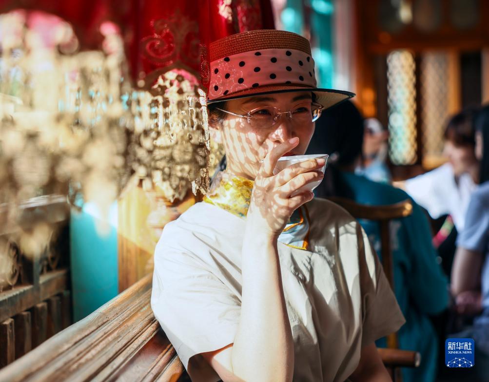 游客在新疆喀什古城百年老茶館內品茶(9月7日攝)。