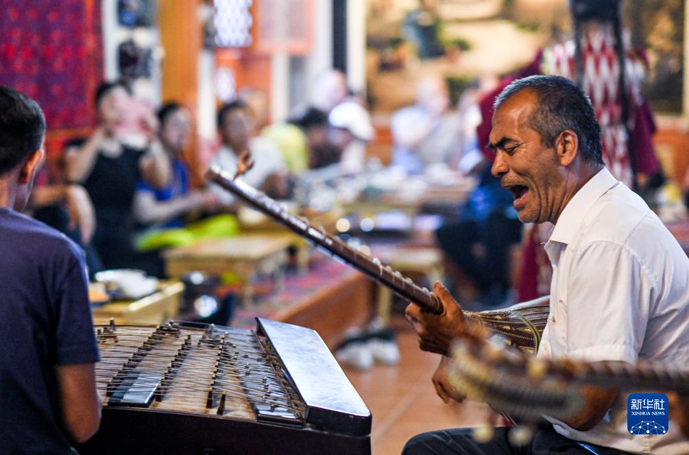 樂(lè )手在新疆喀什古城百年老茶館內彈唱(9月15日攝)。