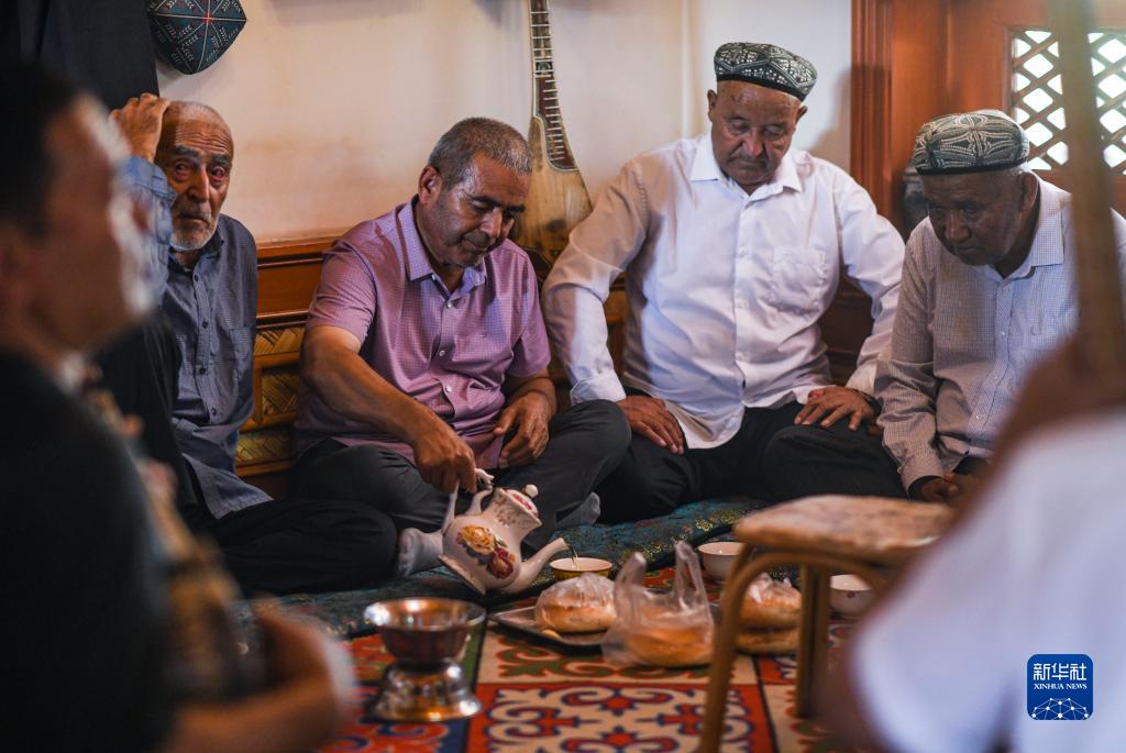 在新疆喀什古城百年老茶館內,人們在品茶(9月16日攝)。