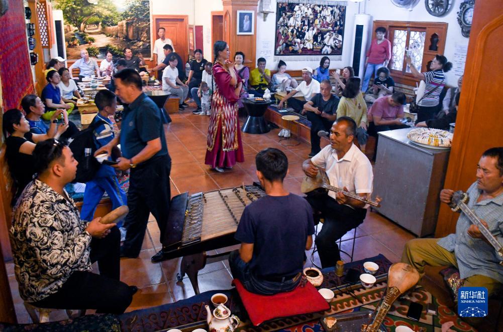 在新疆喀什古城百年老茶館內,樂(lè )手在彈唱,人們隨音樂(lè )起舞(9月15日攝)。