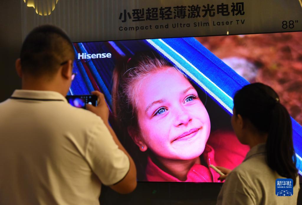 9月19日,參會(huì )者在激光顯示技術(shù)成果展示區觀(guān)看一款超輕薄激光電視。