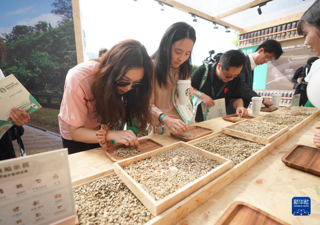 9月19日,在星巴克中國咖啡創(chuàng )新產(chǎn)業(yè)園開(kāi)園儀式現場(chǎng),來(lái)賓在體驗挑揀咖啡生豆。