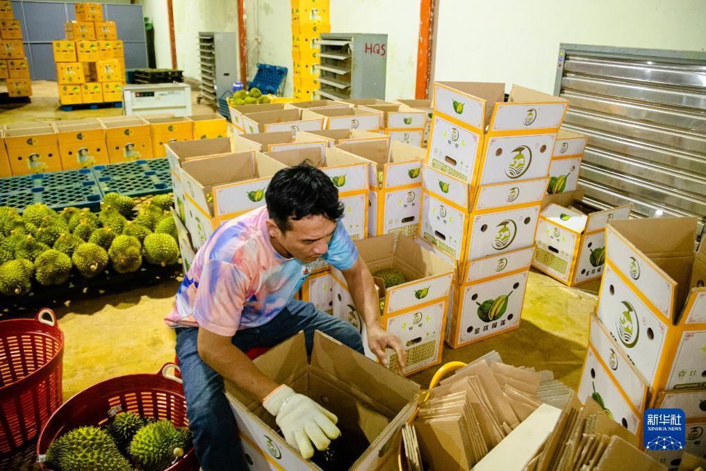 9月15日,在越南多樂(lè )省一家榴蓮加工廠(chǎng),一名工人在打包榴蓮。