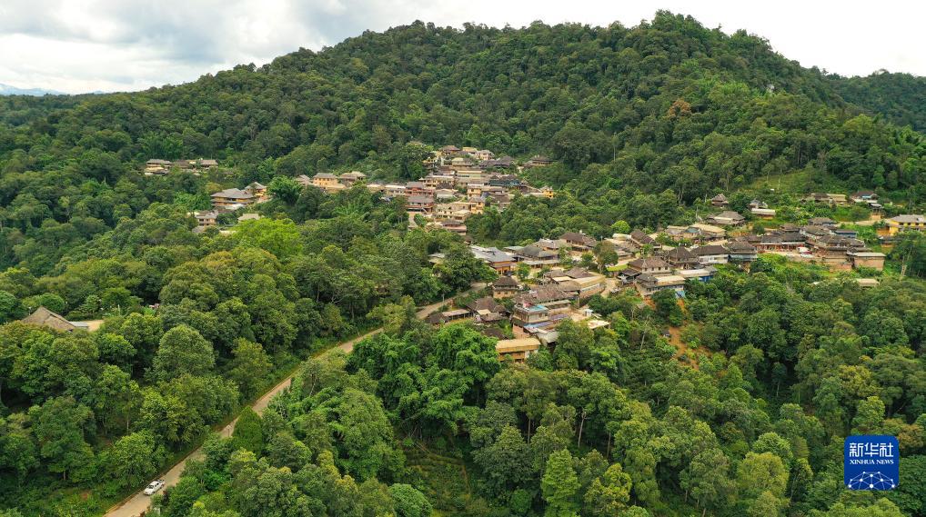 在景邁山,古村寨掩映在大片山林茶園之間,形成了山共林、林生茶、茶繞村的獨特生態(tài)景觀(guān)(8月29日,無(wú)人機拍攝)。