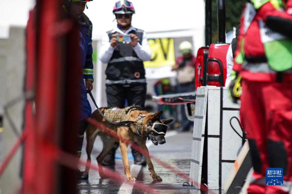 9月19日,在墨西哥首都墨西哥城,一只救援犬參加地震演習。