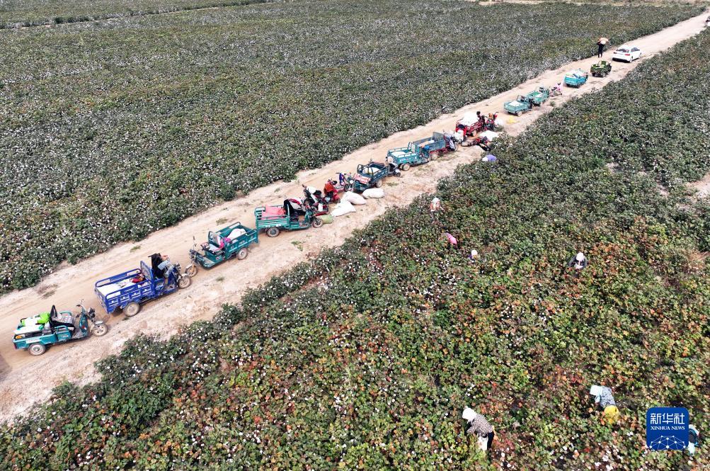 9月19日,山東省無(wú)棣縣西小王鎮棉農在采收新棉(無(wú)人機照片)。