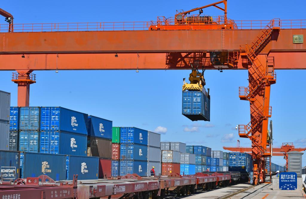 9月19日,在中歐班列(沈陽(yáng))集結中心,中國鐵路沈陽(yáng)局集團有限公司工作人員使用龍門(mén)吊進(jìn)行中歐班列裝車(chē)作業(yè)。