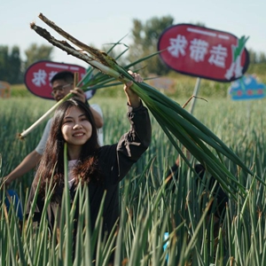 9月20日,在北京市平谷區東高村鎮趙家務(wù)村大蔥種植基地,市民在活動(dòng)現場(chǎng)體驗拔大蔥。