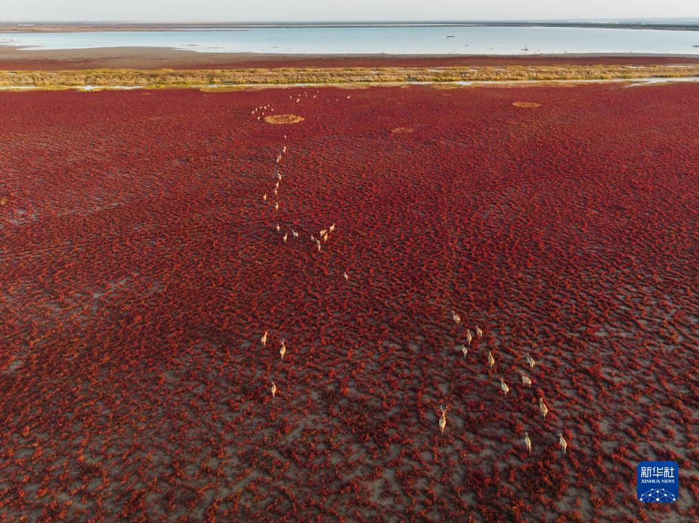 麋鹿在鹽城東臺條子泥濕地生活(2022年11月9日攝,無(wú)人機照片)。