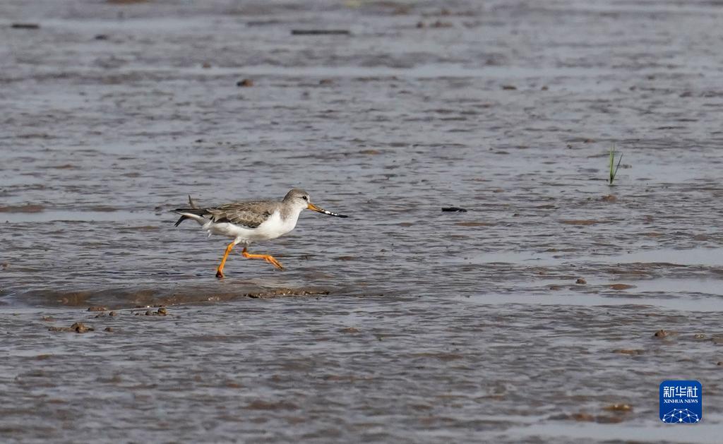 一只翹嘴鷸在東臺條子泥濕地灘涂上覓食(9月1日攝)。