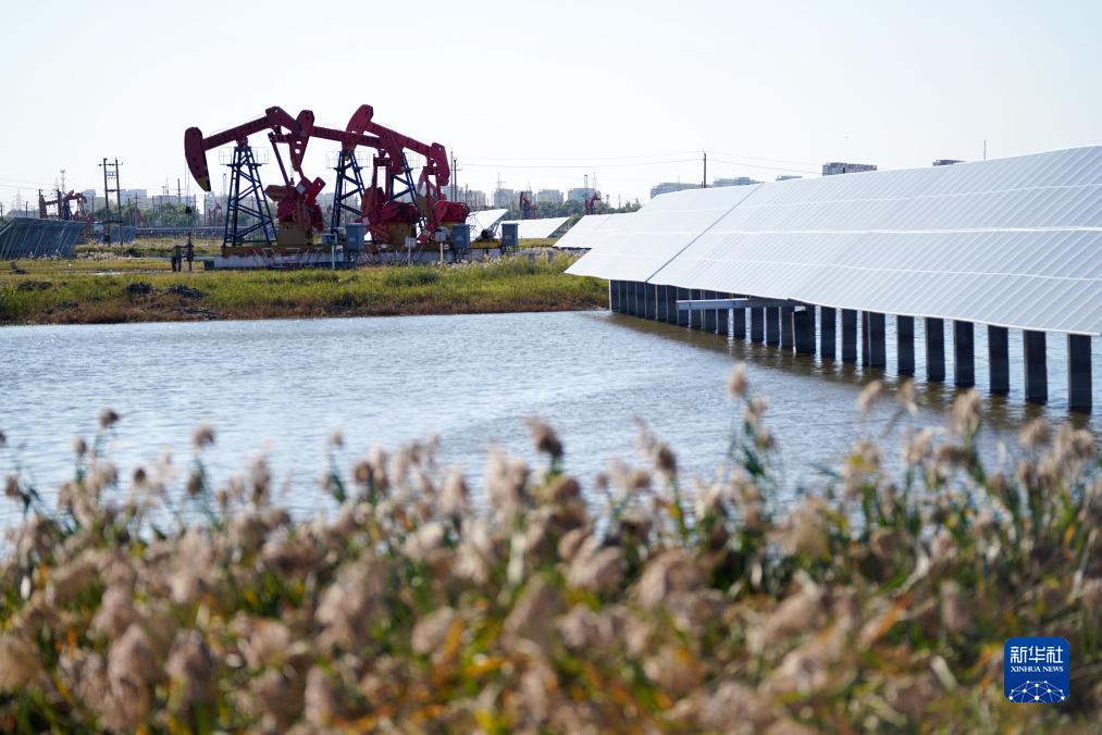 9月19日,在大慶油田星火水面光伏電站,電站設施與附近的抽油機相映成趣。