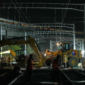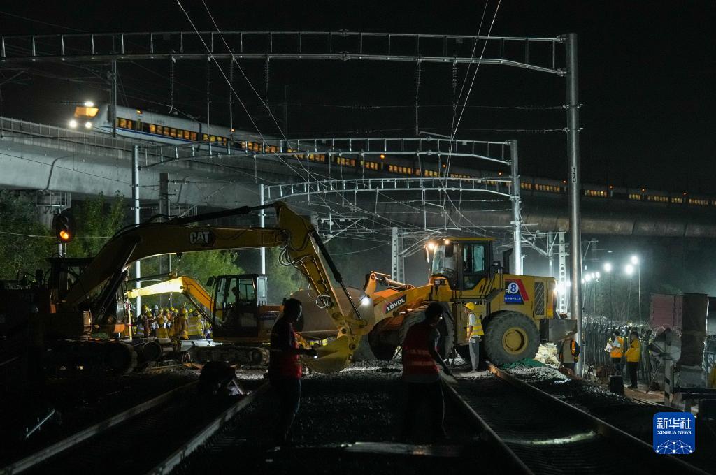 9月19日夜晚,施工人員在滬昆鐵路上海七寶至春申段線(xiàn)路上作業(yè)。