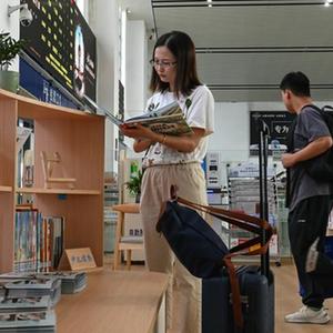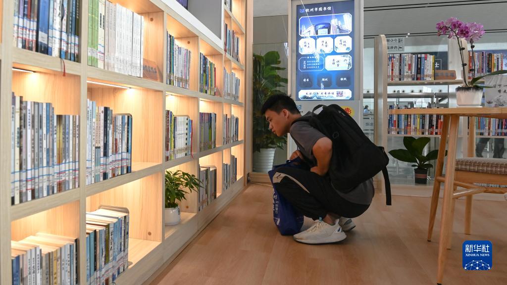 9月20日,在欽州東站,一名乘客在高鐵讀書(shū)驛站尋找心儀的書(shū)籍。