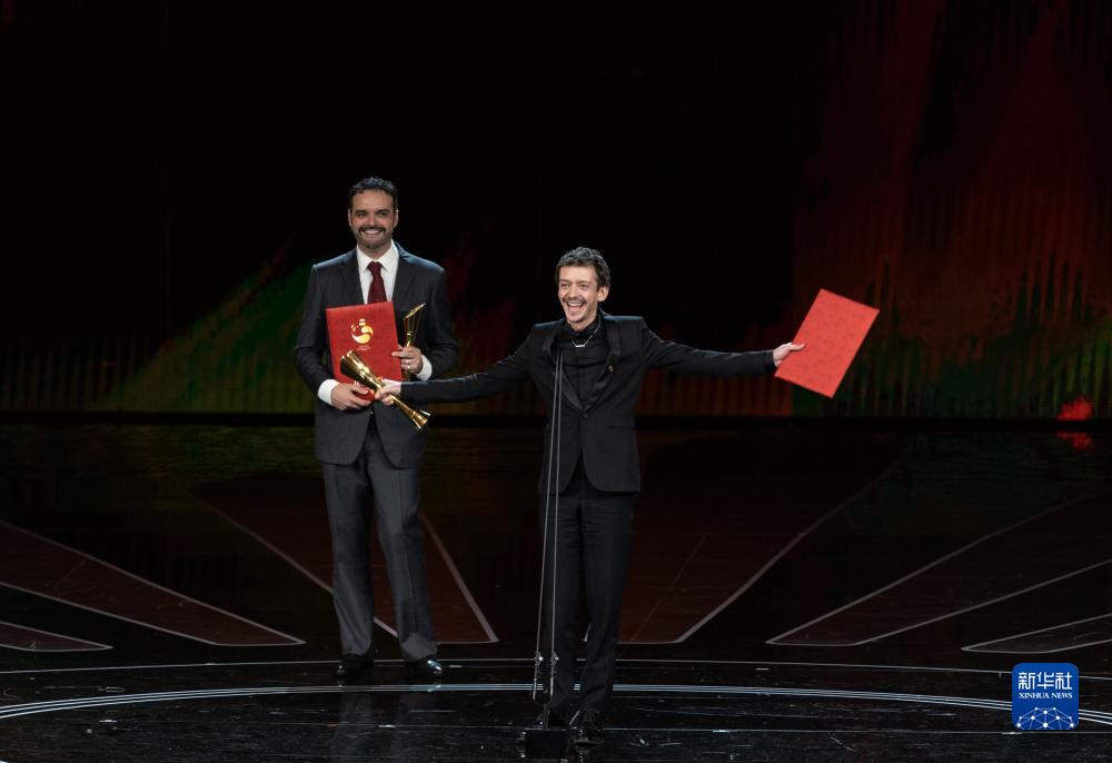 9月20日,首屆金熊貓盛典上,電影單元最佳男主角獎獲得者納威爾·佩雷茲·畢斯卡亞特(右)發(fā)表獲獎感言。