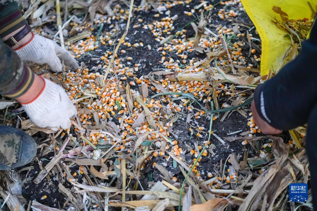 在位于雙鴨山市友誼縣的北大荒農業(yè)股份有限公司友誼分公司一地塊,農場(chǎng)職工將從接粒車(chē)上掉落的玉米粒撿起收好(9月20日攝)。