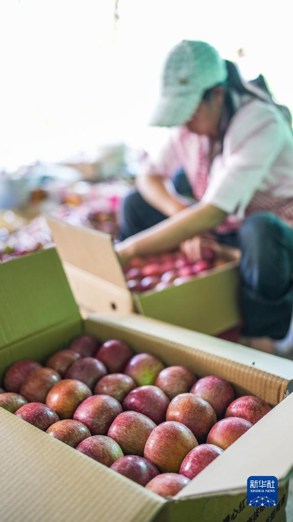 威寧彝族回族苗族自治縣雪山鎮謝家村村民將蘋(píng)果分揀裝箱(9月20日攝)。