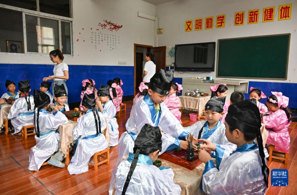 9月20日,重慶市忠縣烏楊小學(xué)茶藝社團的學(xué)生在學(xué)習茶藝。