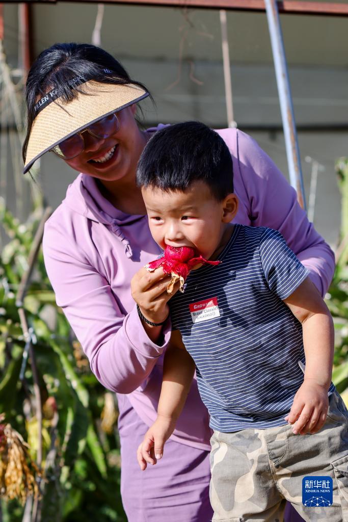 木壘縣博泰農業(yè)科技開(kāi)發(fā)有限責任公司負責人朱娜給孩子品嘗試種的火龍果(9月20日攝)。