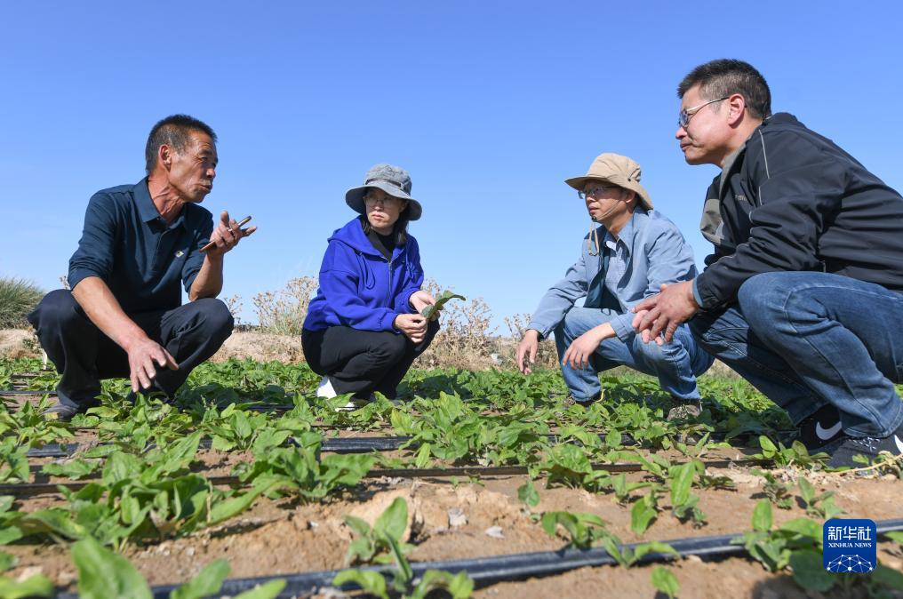 來(lái)自福建省南平市光澤縣農業(yè)農村局的援疆干部呂軍(右一)、來(lái)自福建省武夷山市經(jīng)濟作物技術(shù)站的援疆干部黃文慶(右二)和來(lái)自福建省漳州市農業(yè)農村局的黃素英(左二),與新疆木壘生福生態(tài)農業(yè)發(fā)展有限公司負責人閆生福交流試種的大葉蛋白菊生長(cháng)情況(9月20日攝)。