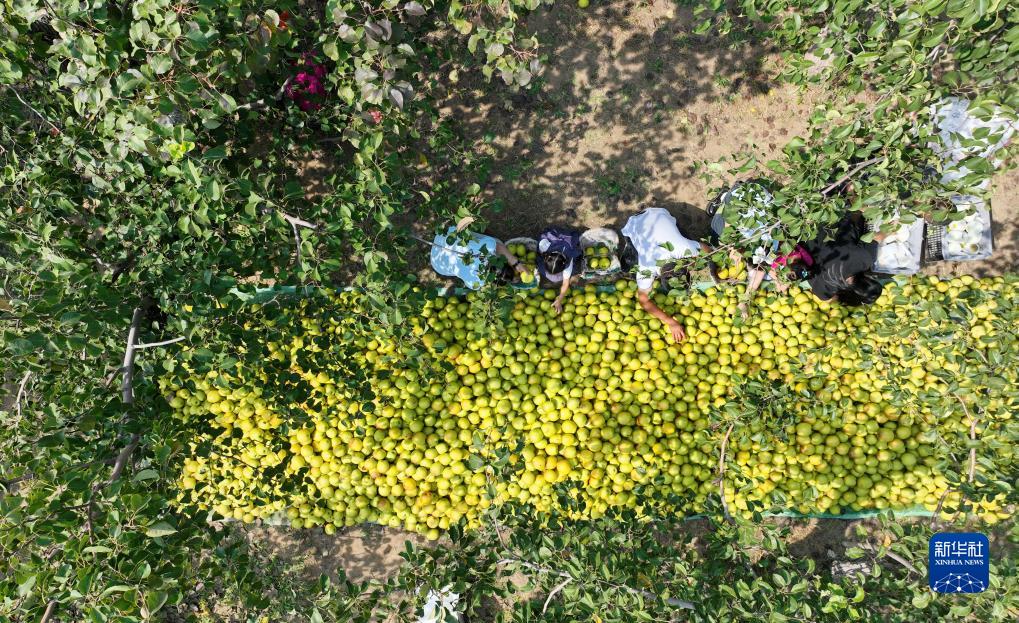 農民和游客在趙縣樂(lè )植堂梨果種植專(zhuān)業(yè)合作社的梨園內整理雪花梨(9月22日攝,無(wú)人機照片)。