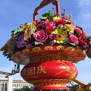 “祝福祖國”巨型花籃主體亮相天安門(mén)廣場(chǎng)
