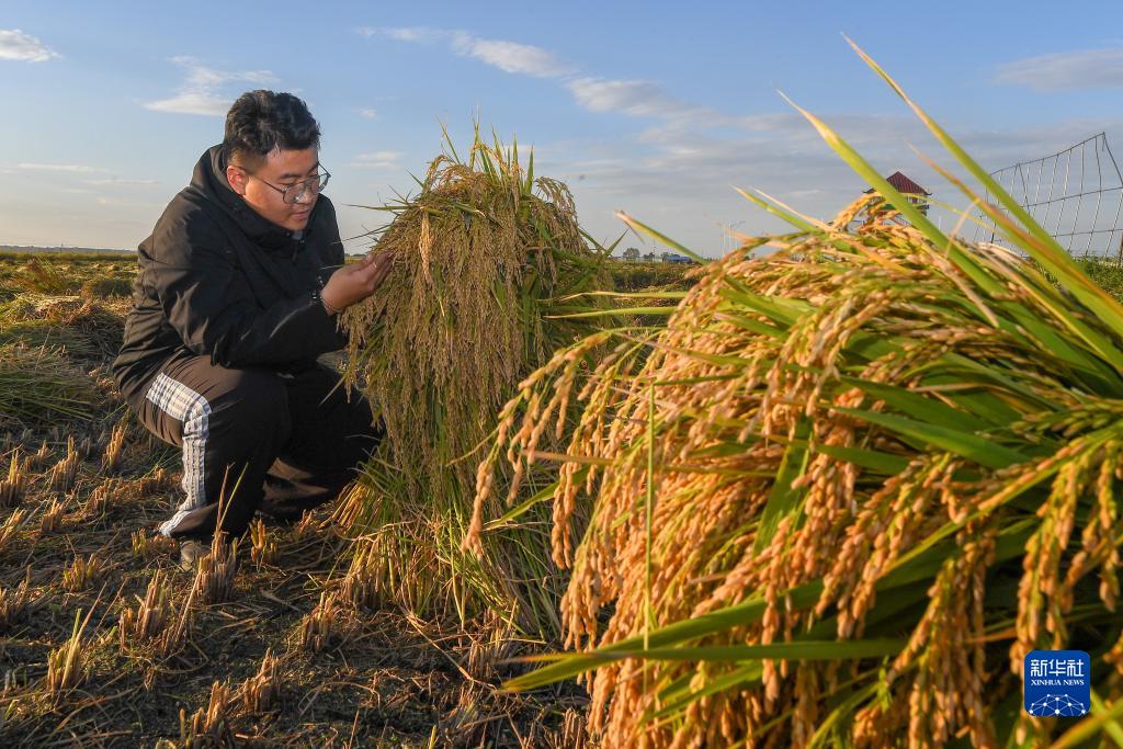 9月21日,在吉林省舒蘭市平安鎮金星村,技術(shù)指導員楊佳剛查看水稻收割情況。
