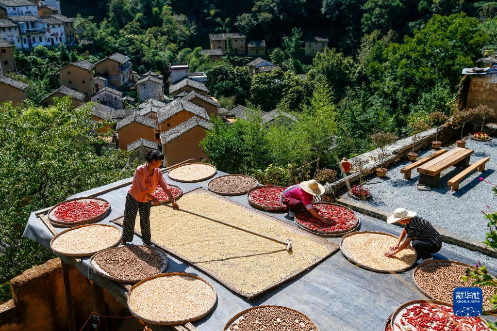 9月18日,在黃山市歙縣陽(yáng)產(chǎn)村,村民在曬場(chǎng)上晾曬農作物。