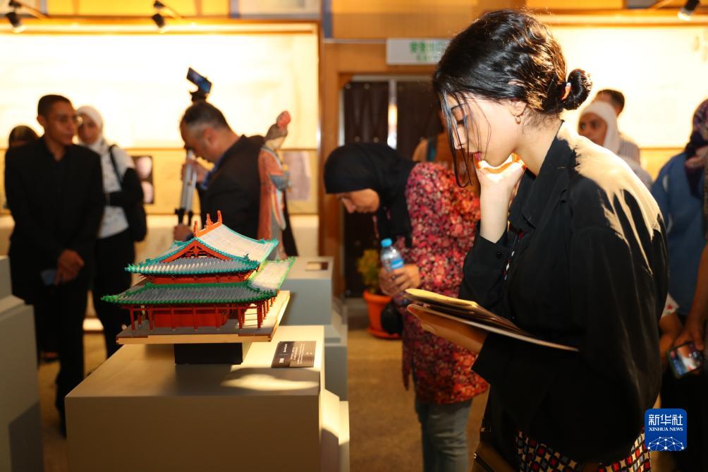 9月23日,一名參觀(guān)者在埃及開(kāi)羅舉行的天龍山石窟數字復原國際巡展上觀(guān)看展品。