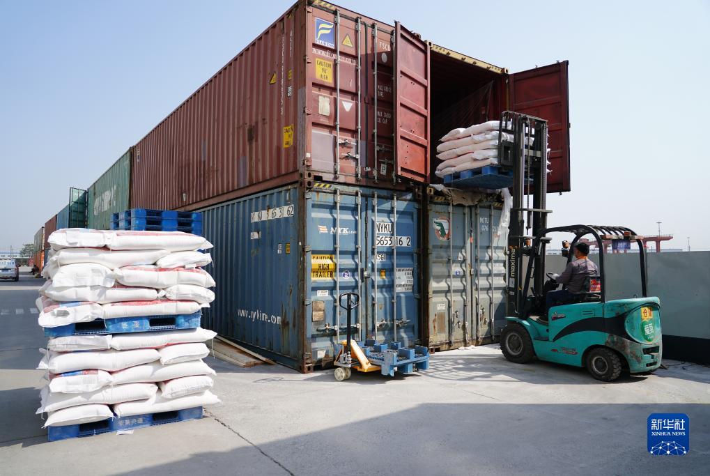 在西安國際港站附近的一家農產(chǎn)品物流加工園區內,工人用叉車(chē)卸下中歐班列長(cháng)安號運回的進(jìn)口面粉(2020年4月8日攝)。