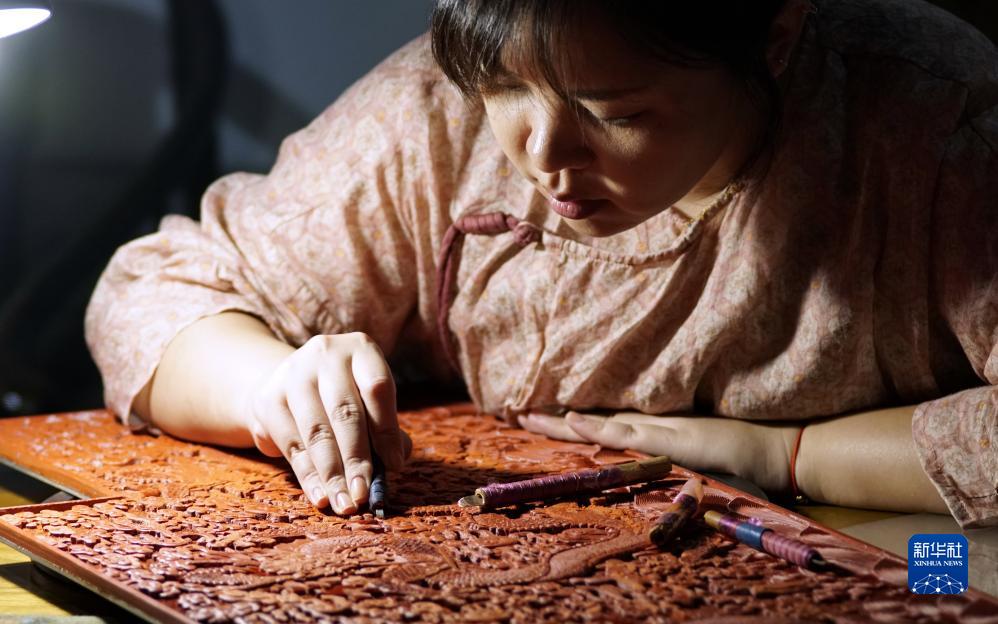 海燕在進(jìn)行大型雕漆作品創(chuàng )作(9月8日攝)。