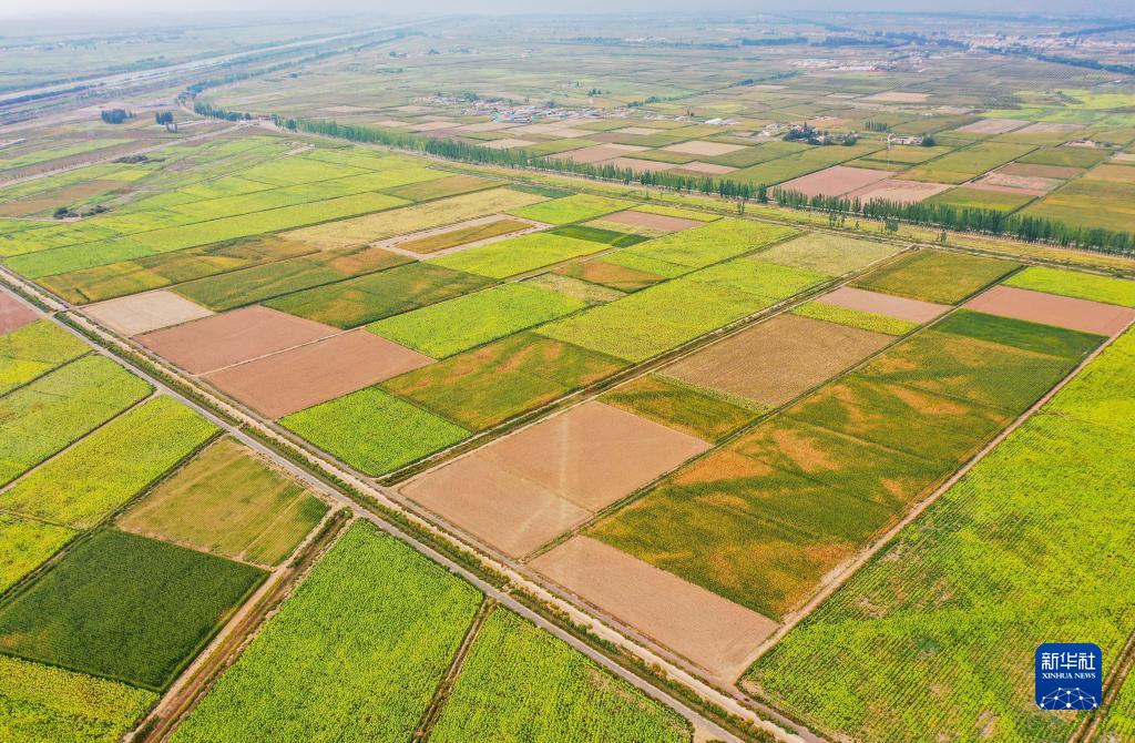 這是內蒙古巴彥淖爾市臨河區城關(guān)鎮使用節水技術(shù)灌溉的農田(無(wú)人機照片,9月14日攝)。