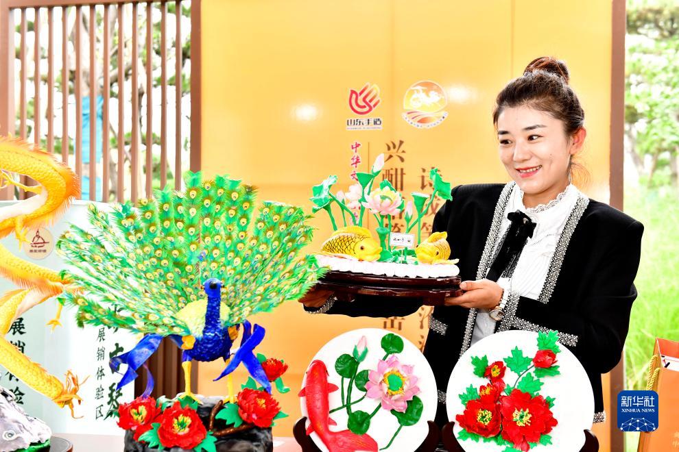9月26日,在第九屆尼山世界文明論壇“山東手造”精品展區,與會(huì )人員在展示山亭面塑作品。
