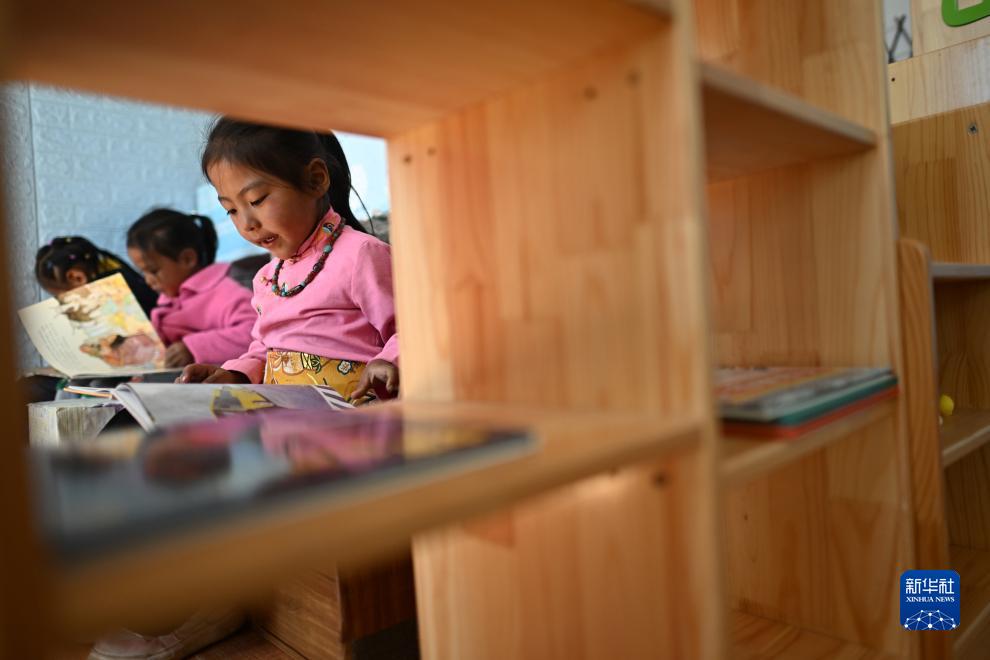 在曲麻萊縣麻多鄉幼兒園,美多永藏(右一)在課堂上閱讀繪本(9月20日攝)。