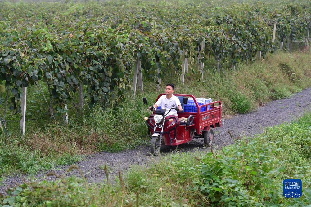 9月26日,段鵬飛在種植園里運送獼猴桃。
