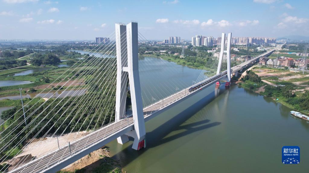 9月26日,列車(chē)經(jīng)過(guò)位于廣州市增城區的廣汕高鐵增江特大橋(無(wú)人機照片)。