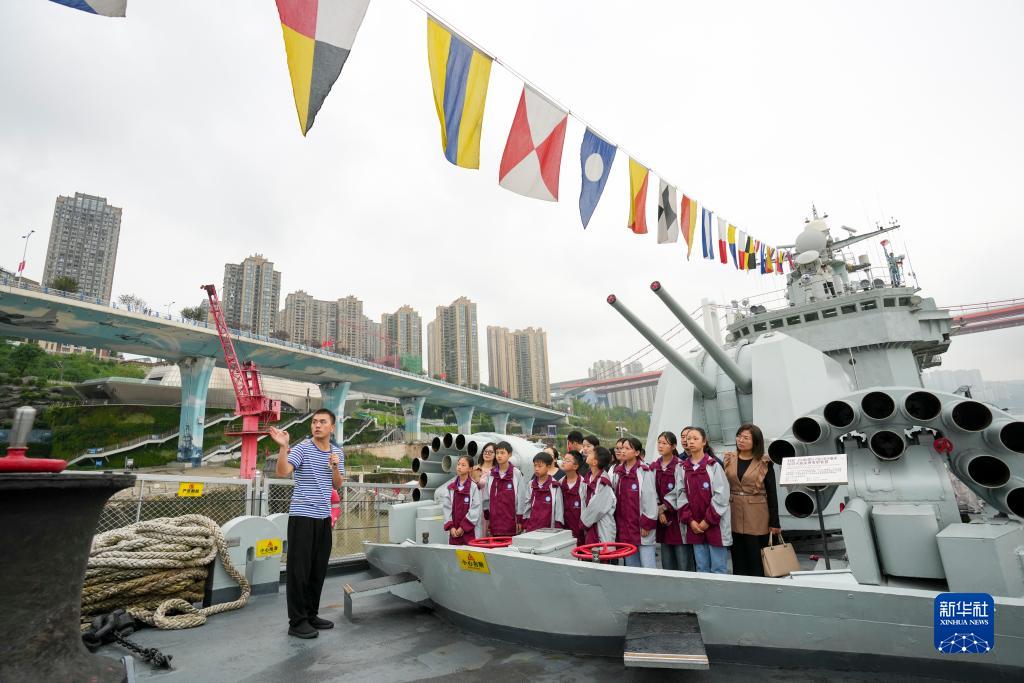 9月26日,在重慶建川海疆博物館展出的我國海軍退役軍艦上,城口縣蓼子鄉第一中心小學(xué)的學(xué)生、教師代表在體驗鐵路小學(xué)愛(ài)國主義教育主題課校外活動(dòng)。