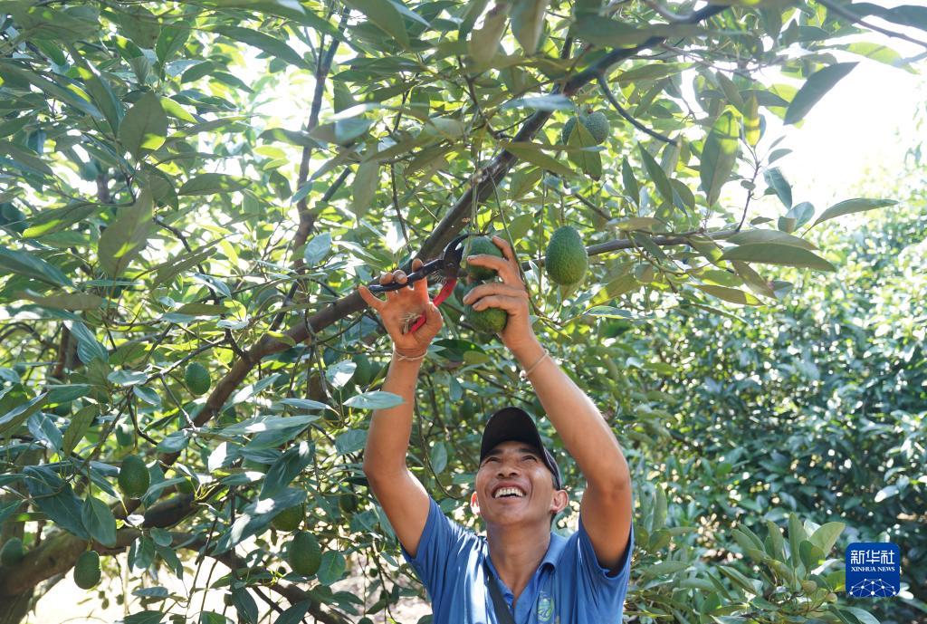 9月26日,在云南省普洱市孟連傣族拉祜族佤族自治縣娜允鎮牛油果種植基地,村民在采摘牛油果。