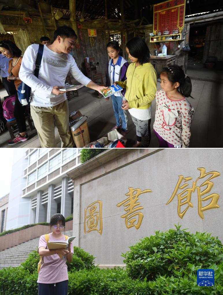 這是一張拼版照片,上圖為:在廣西都安瑤族自治縣拉烈鎮崇業(yè)村弄后屯,愛(ài)心人士給藍曉萍(右三)姐妹捐贈書(shū)籍(2015年4月25日攝);下圖為:在廣西南寧師范大學(xué),藍曉萍走在圖書(shū)館前(2023年9月26日攝)。
