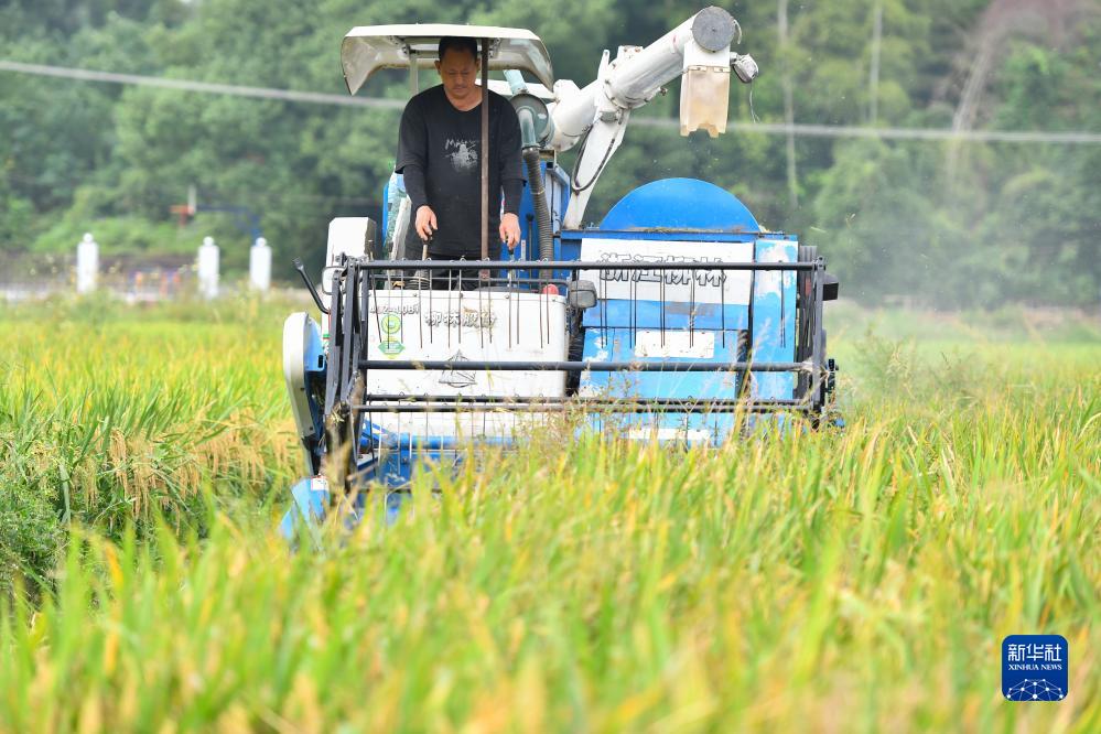 金秋時(shí)節,湖南省瀏陽(yáng)市沿溪鎮種植的中稻迎來(lái)收獲季,當地農民搶抓農時(shí)收割水稻,稻田里一派繁忙景象。